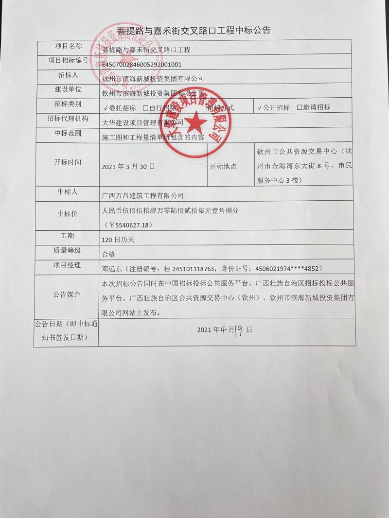 菩提路與嘉禾街交叉路口工程中標(biāo)公告
