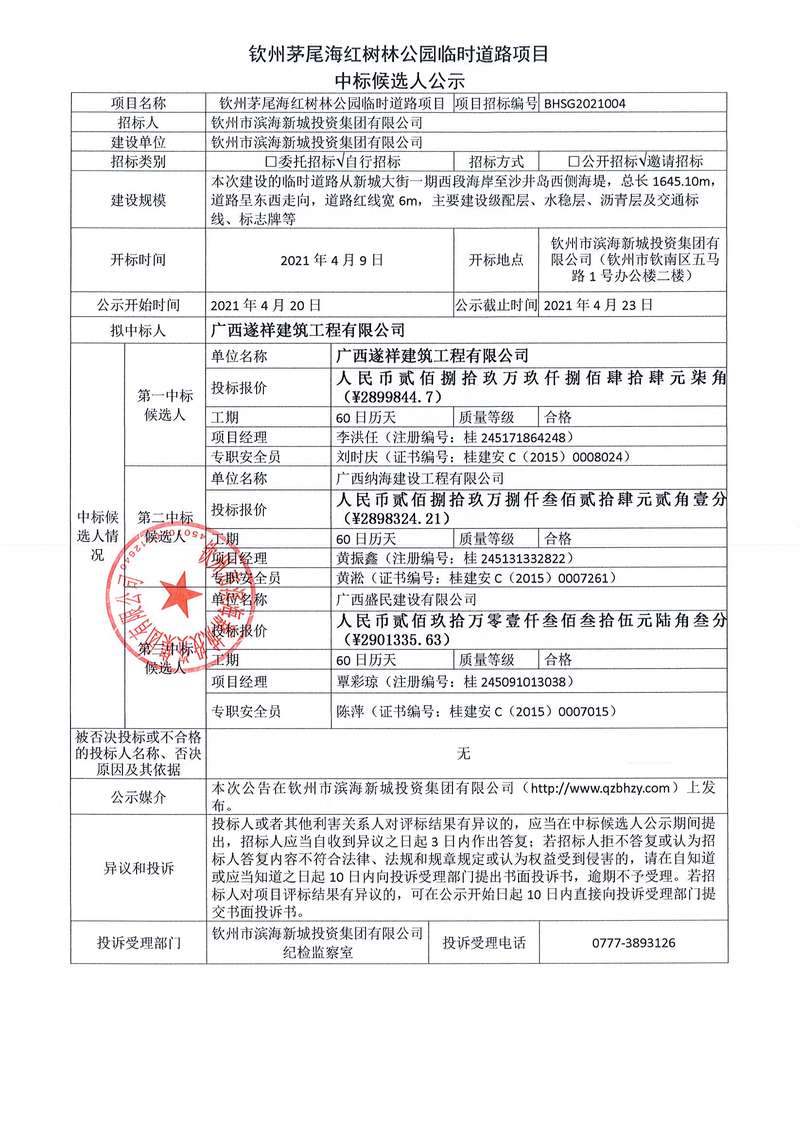 中標(biāo)候選人公示-欽州市濱海新城環(huán)島南路Ⅰ標(biāo)段(北部灣大道至云湖路段)道路工程施工