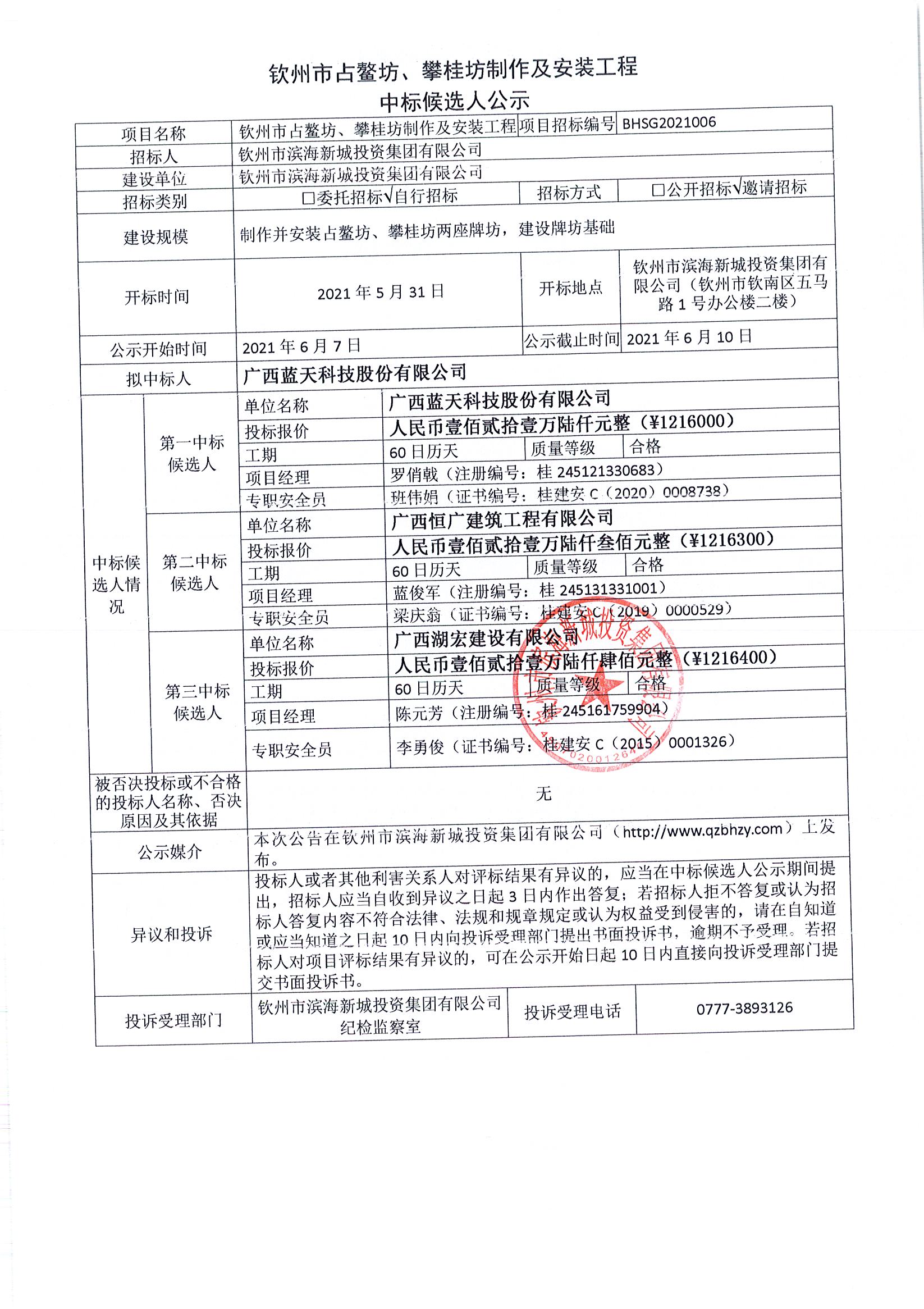 欽州市占鰲坊、攀桂坊制作及安裝工程-中標(biāo)候選人公示