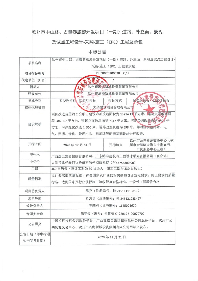 中標公示-欽州市中山路、占鰲巷旅游開發(fā)項目(一期)道路、外立面、景觀及試點工程設(shè)計-采購-施工(EPC)工程總承包中標公告