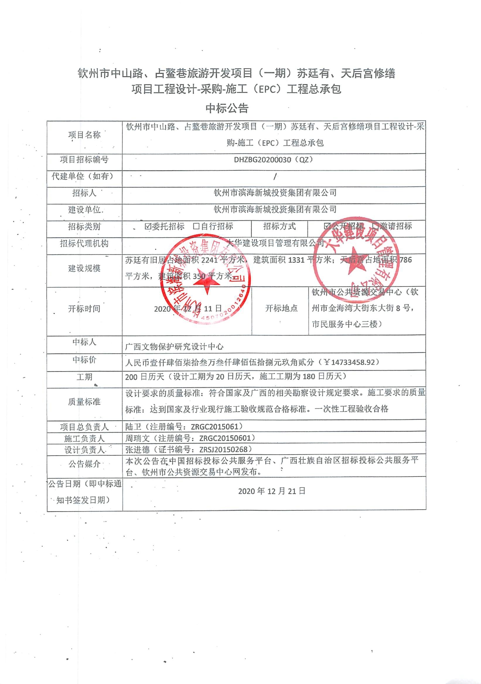 中標公示-欽州市中山路、占鰲巷旅游開發(fā)項目(一期)蘇廷有、天后宮修繕項目工程設(shè)計-采購-施工(EPC)工程總承包中標公告