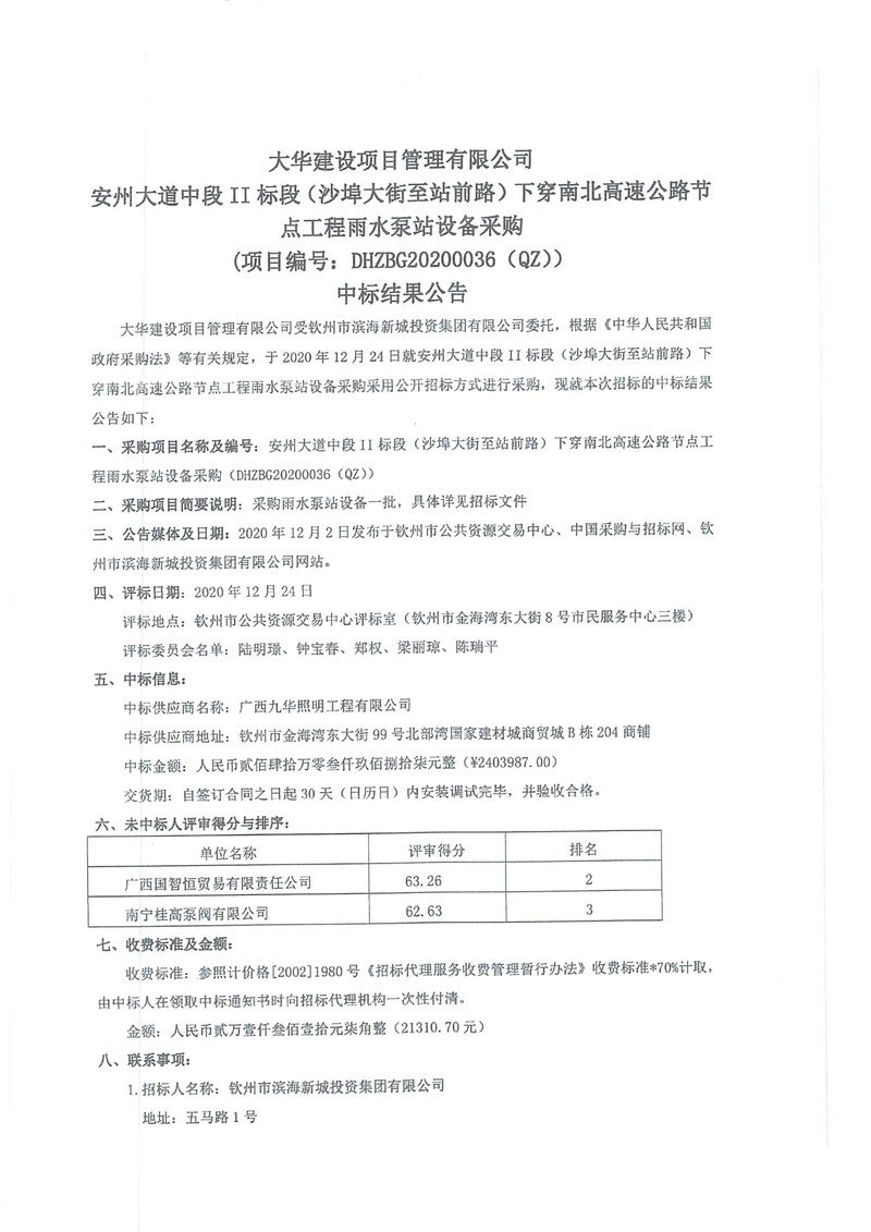 安州大道中段II標段(沙埠大街至站前路)下穿南北高速公路節(jié)點工程雨水泵站設(shè)備采購中標結(jié)果公告