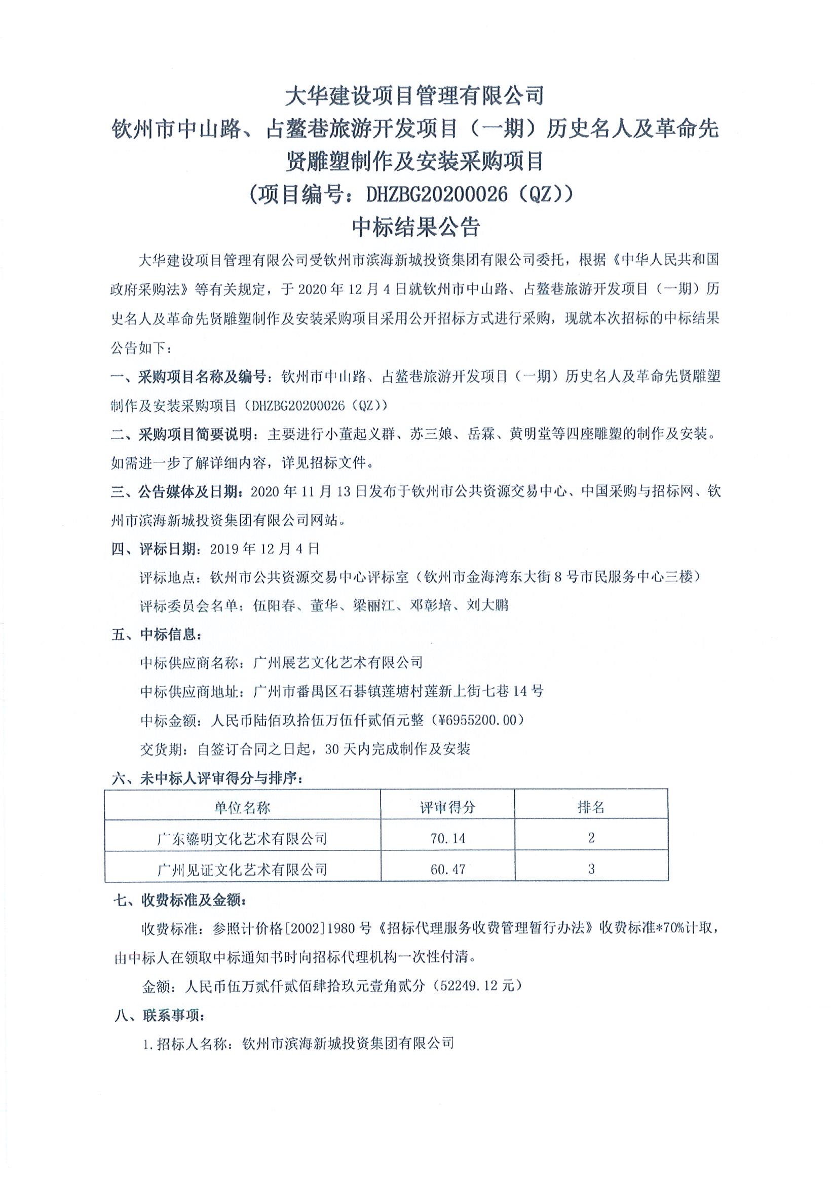 欽州市中山路、占鰲巷旅游開發(fā)項目(一期)歷史名人及革命先賢雕塑制作及安裝采購項目中標結(jié)果公告