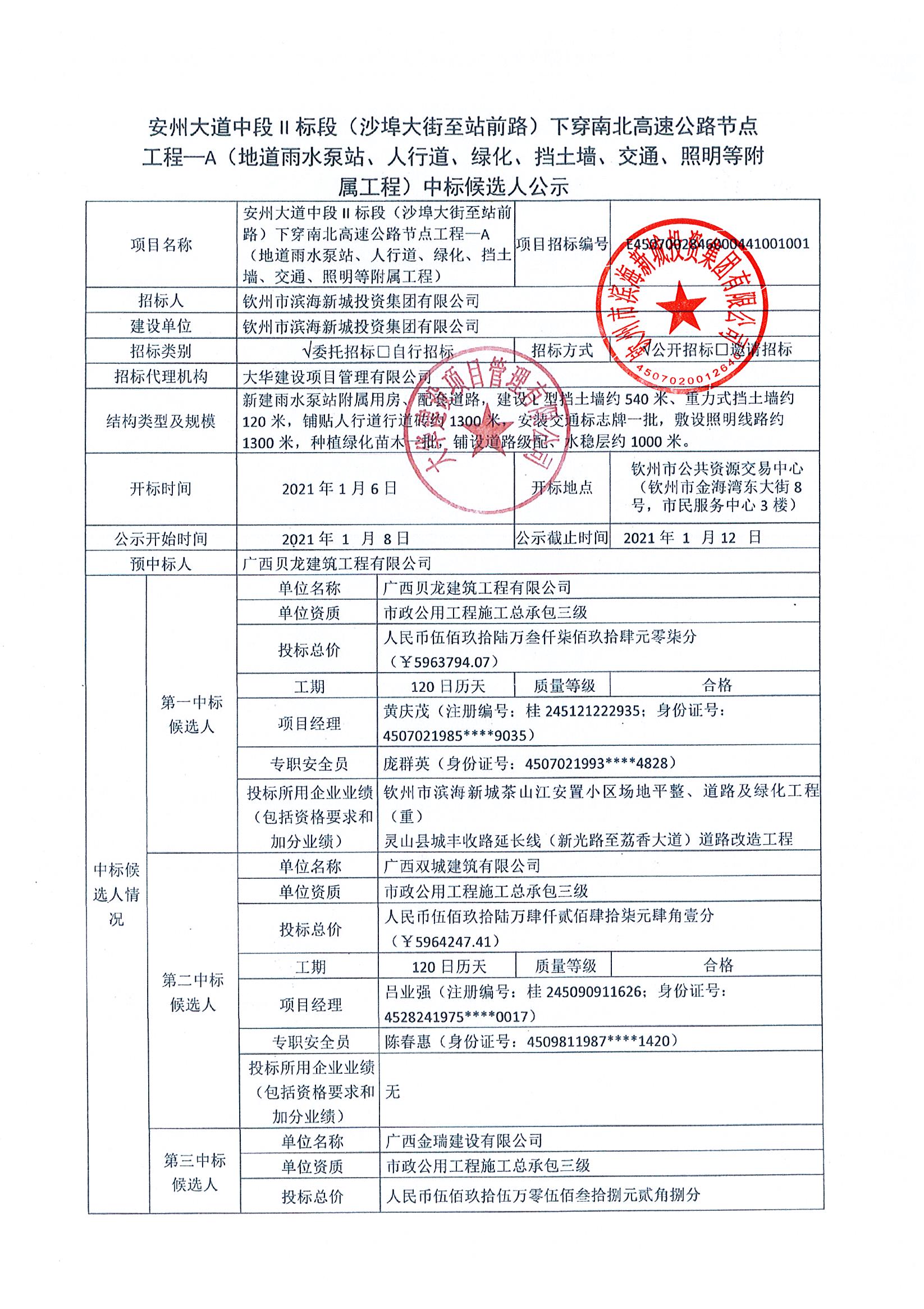欽州市濱海新城茶山江大街項目、安州大道(珊瑚街至嘉興街段)強弱電綜合管溝及平山東大街(濱江東路-揚帆大道)強弱電綜合管溝項目綜合檢測中標候選人公示