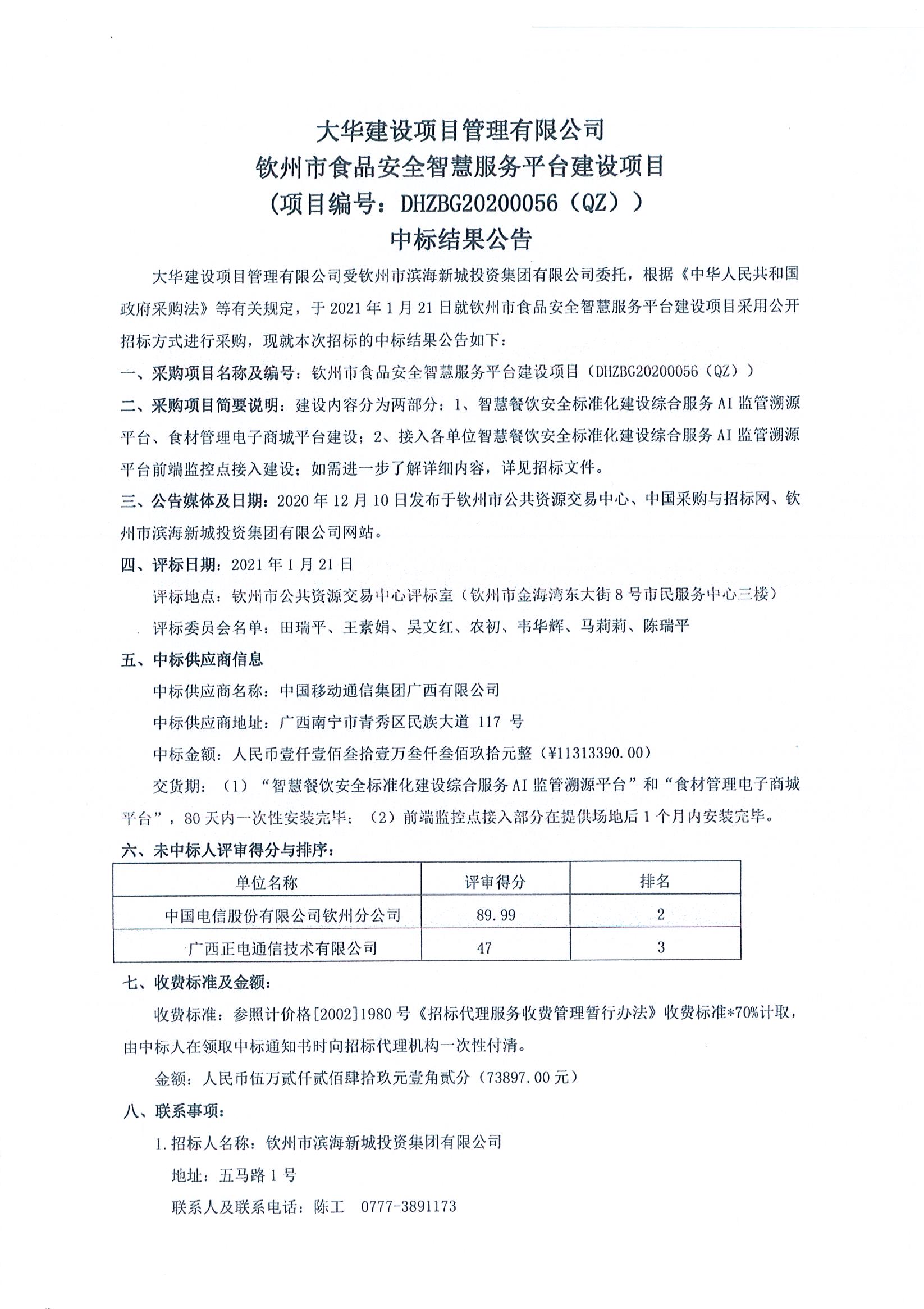 欽州市食品安全智慧服務(wù)平臺建設(shè)項目中標結(jié)果公告