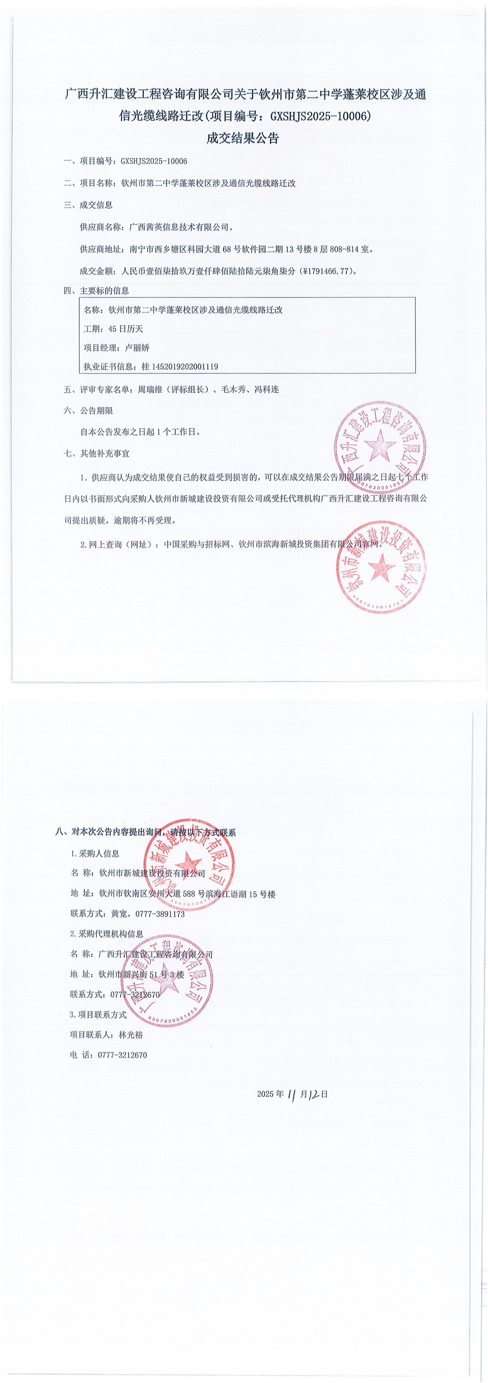 關于欽州市第二中學蓬萊校區(qū)涉及通信光纜線路遷改(項目編號:GXSHJS2025-10006) 成交結果公告