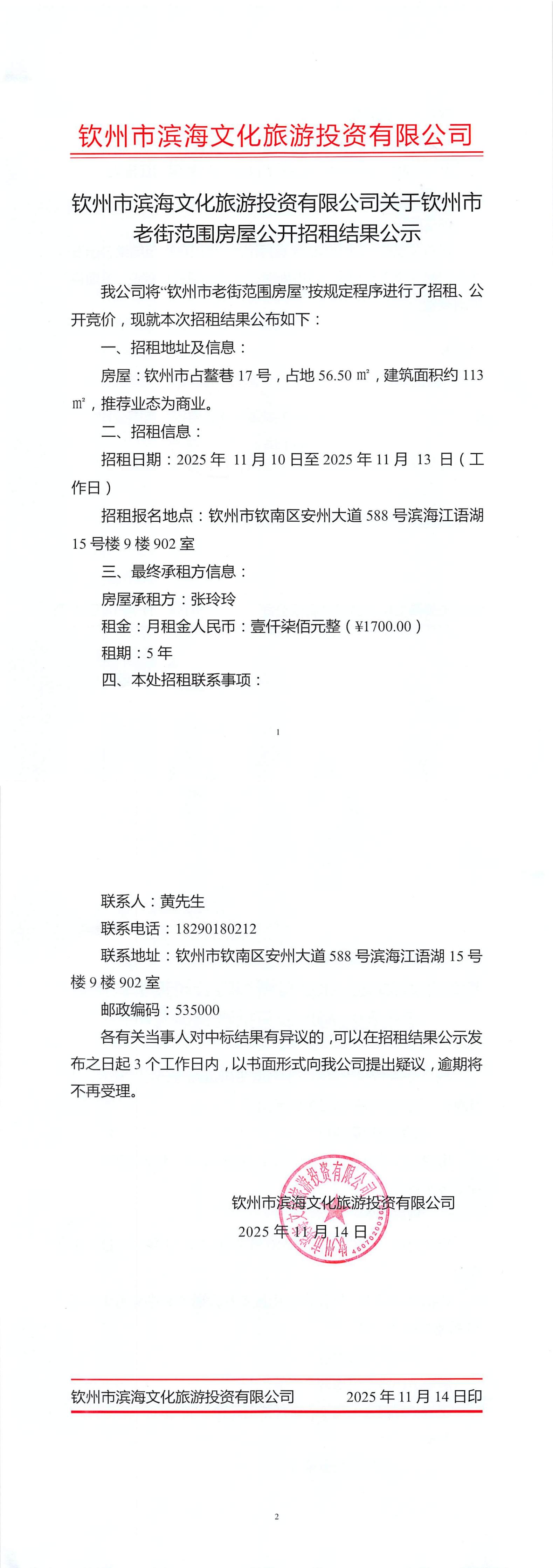 欽州市濱海文化旅游投資有限公司關于欽州市老街范圍房屋公開招租結果公示(欽州市中山路112號)