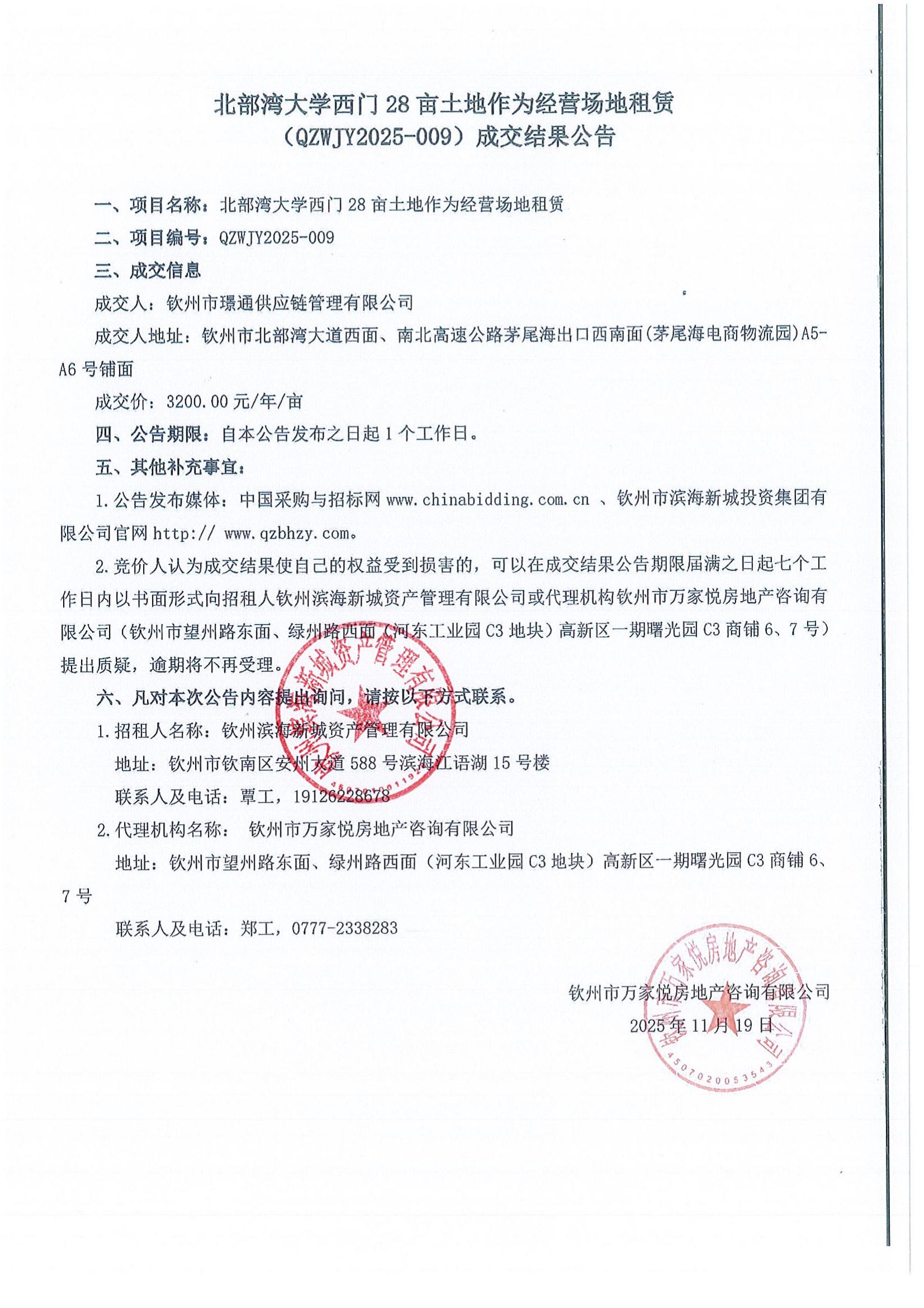 北部灣大學西門28畝土地作為經營場地租賃(QZWJY2025-009)成交結果公告