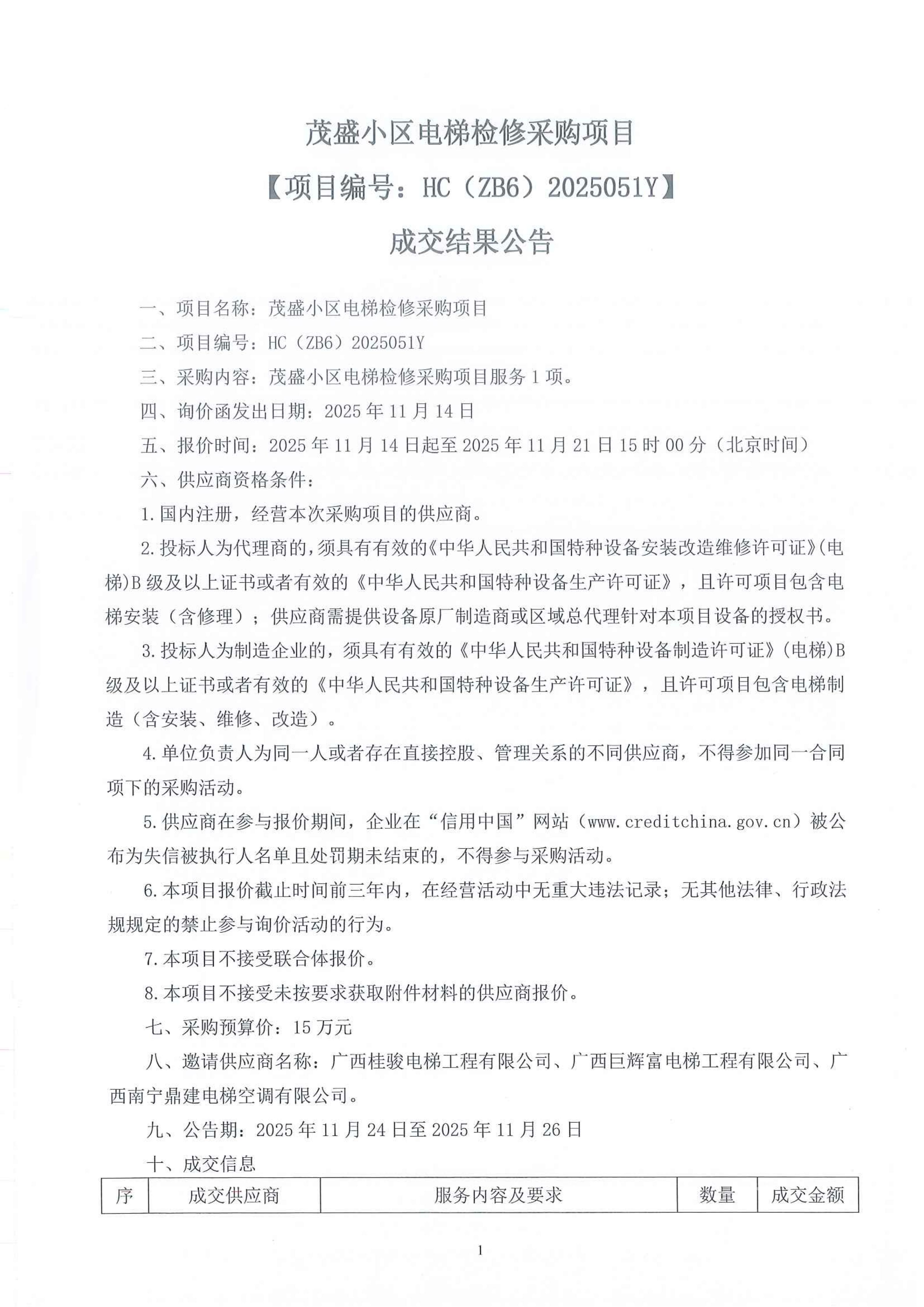 茂盛小區(qū)電梯檢修采購項目【項目編號:HC(ZB6)2025051Y】 成交結果公告