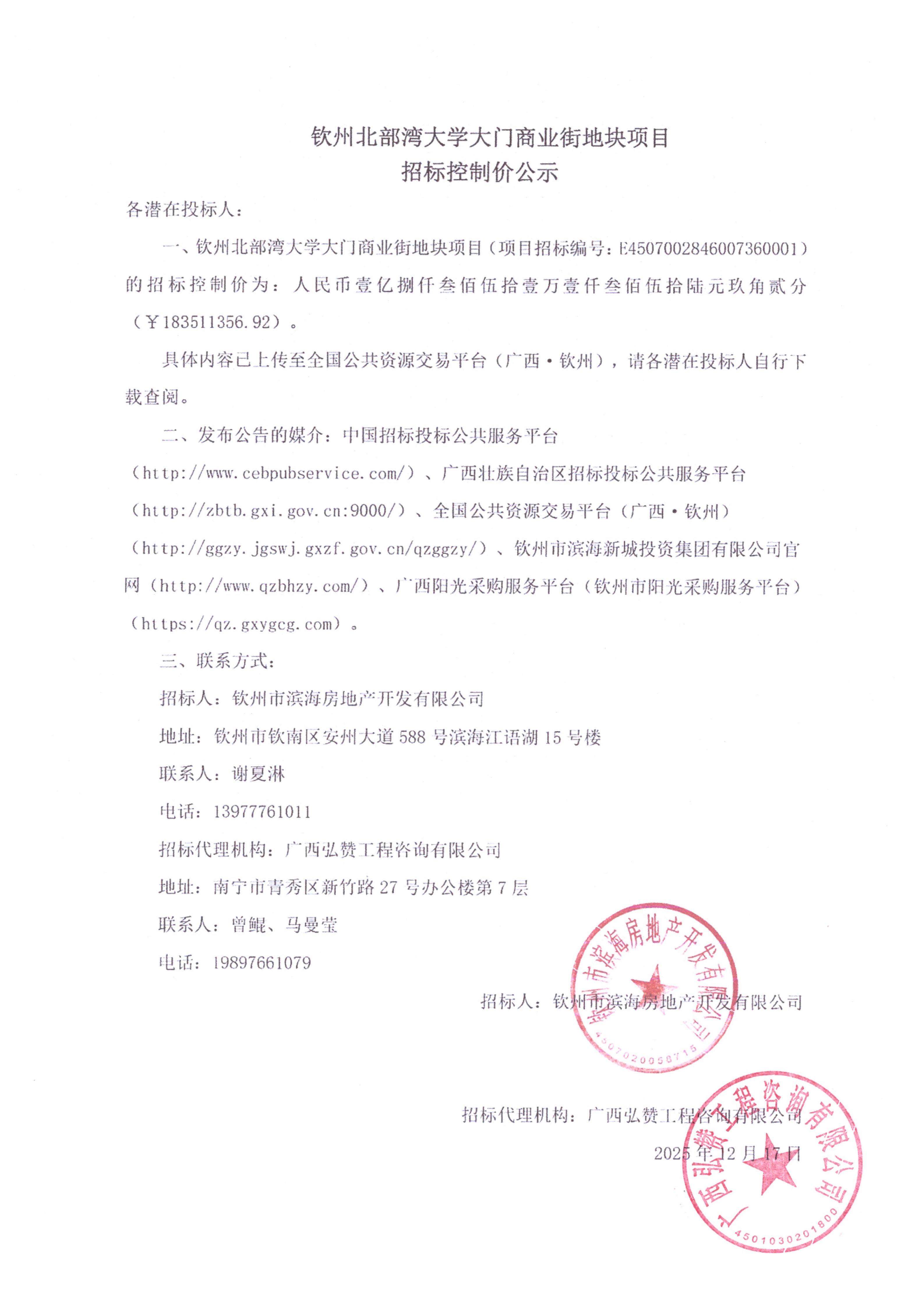 欽州北部灣大學大門商業(yè)街地塊項目招標控制價公示