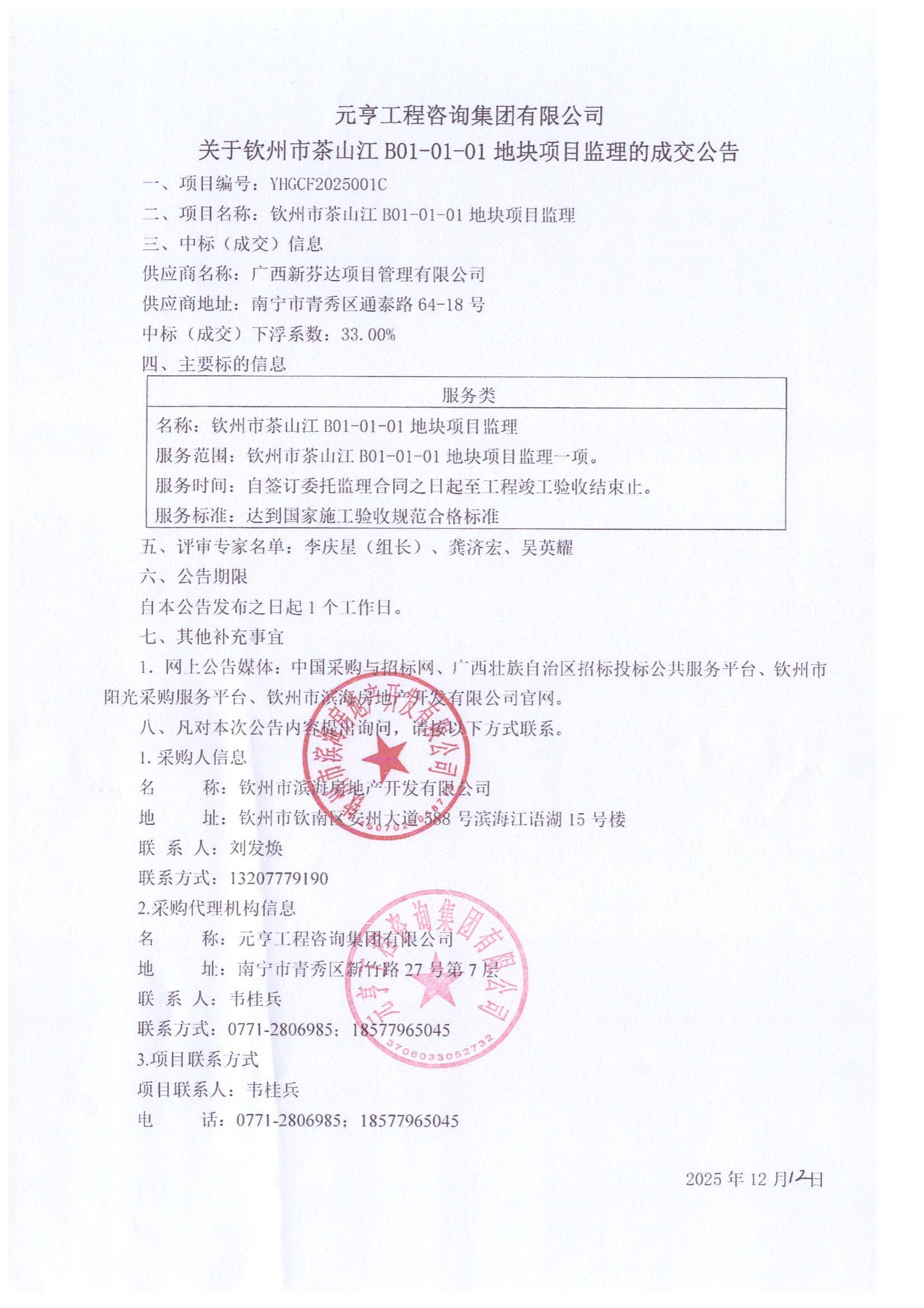 欽州市茶山江 B01-01-01地塊項目監(jiān)理的成交公告