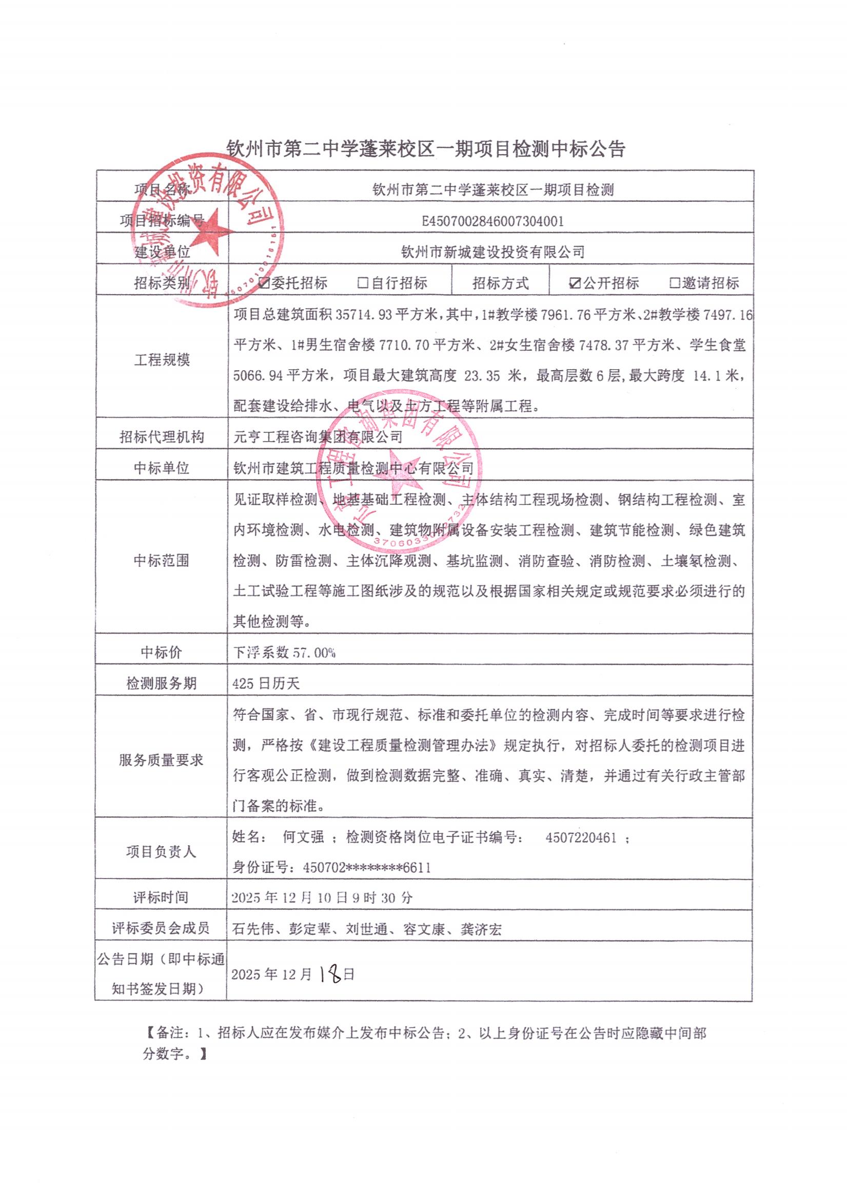 欽州市第二中學蓬萊校區(qū)一期項目檢測中標公告