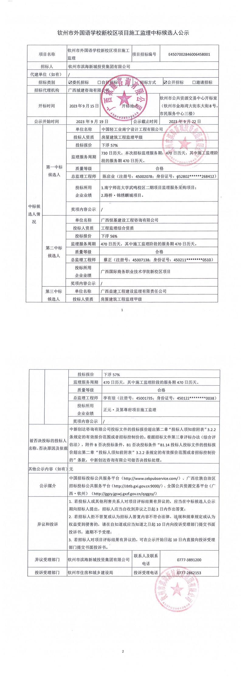 欽州市外國語學校新校區(qū)項目施工監(jiān)理中標候選人公示