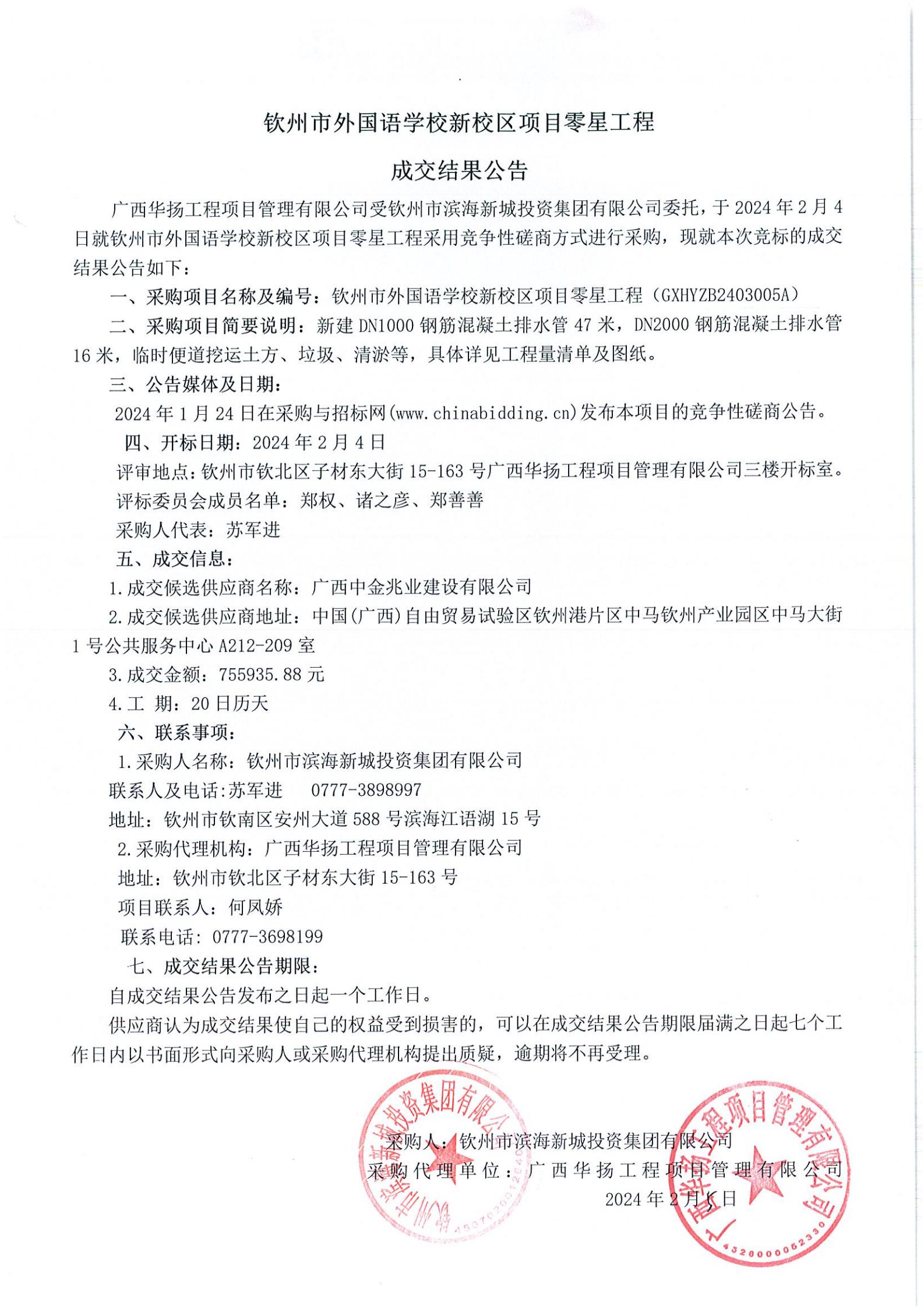 欽州市外國語學校新校區(qū)零星工程成交結(jié)果公告