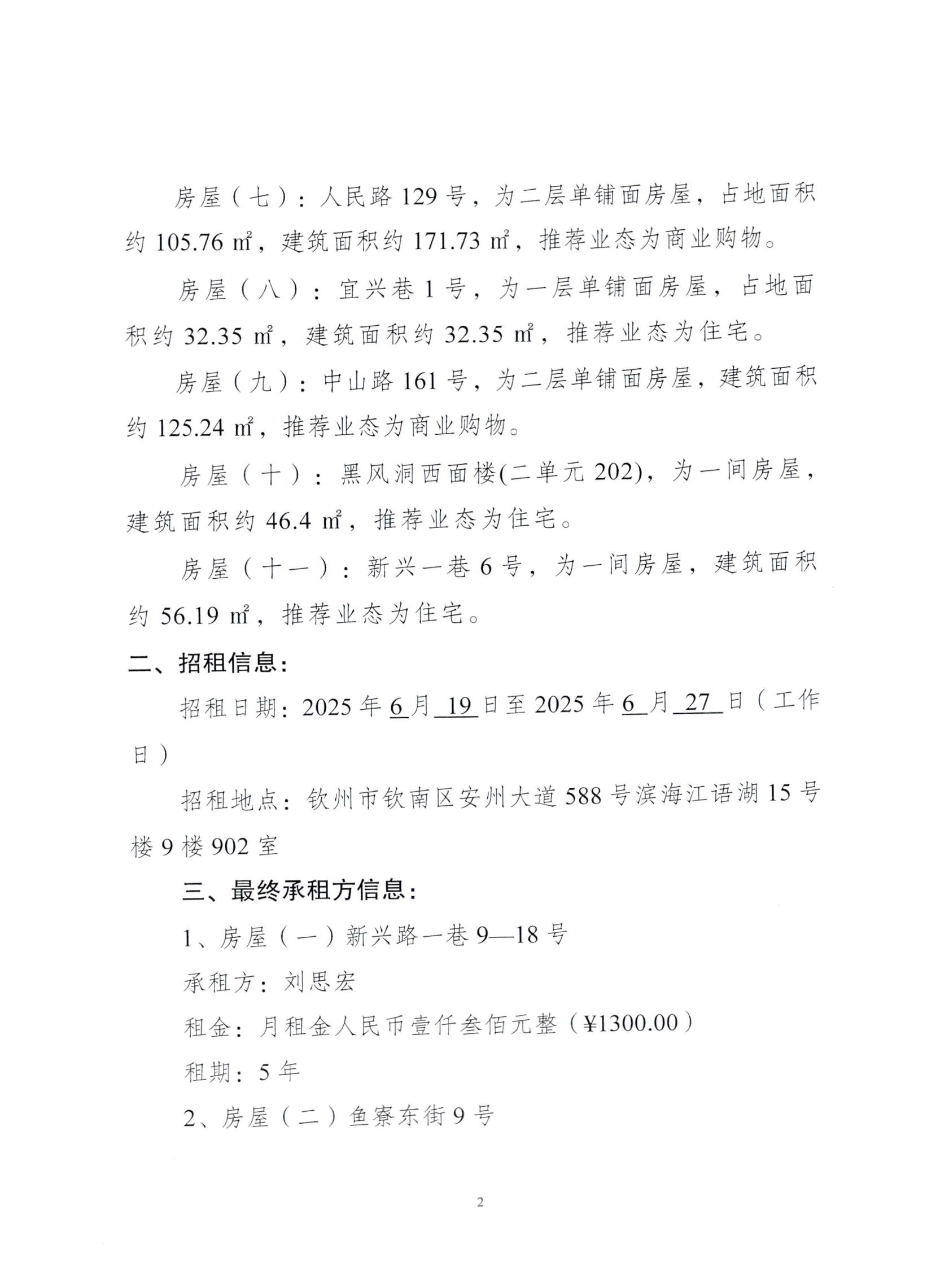 欽州市濱海文化旅游投資有限公司關(guān)于欽州市老街范圍二馬路43號房屋公開招租結(jié)果公示