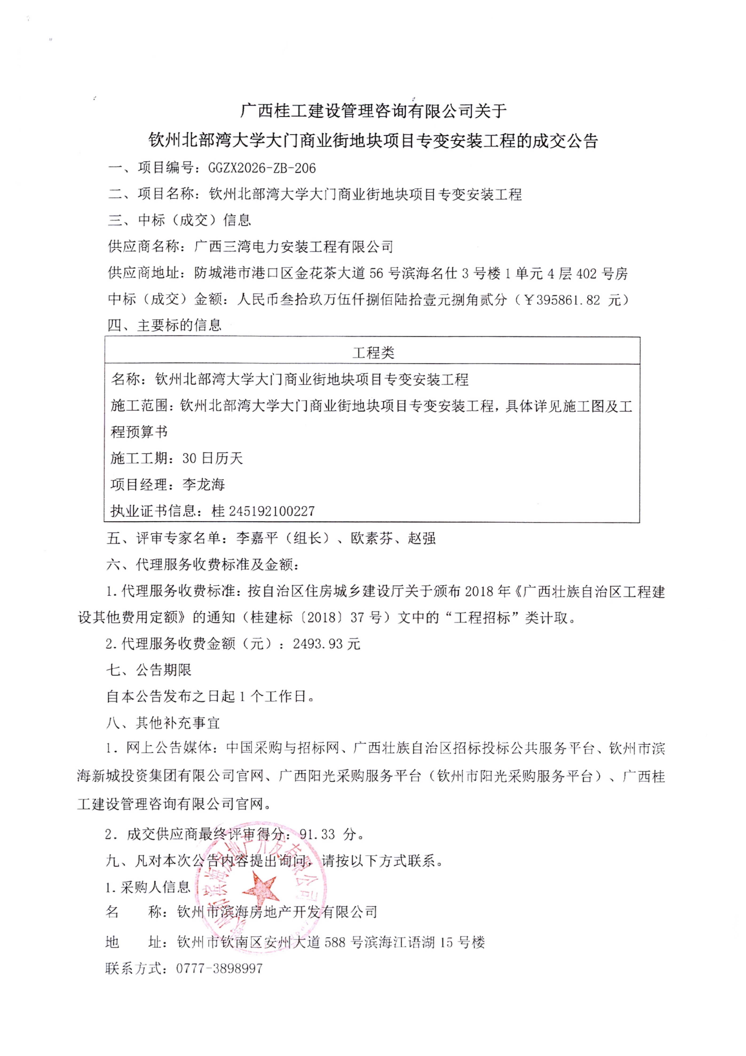 欽州北部灣大學大門商業(yè)街地塊項目專變安裝工程成交公告